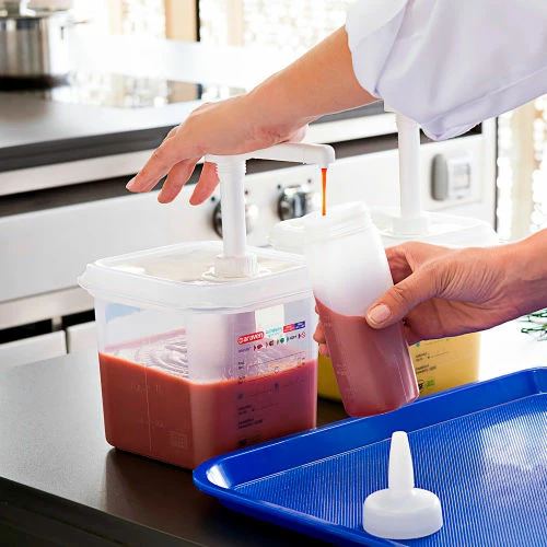 This dispenser comes with everything you need to get started. It includes (1) 1/6 size 6″ deep food pan (2.7 qt.), 1 pump, 1 pack of 4 color clips, and 1 airtight lid, you can set up a convenient condiment station. This dispenser is great for sauces, dressings, and syrups. Thanks to the easy-to-fill design, the dispenser can be refilled quickly so you can continue to offer condiments to your customers. The pump has a dispense rate of 1 oz. per pump to help reduce waste and assist in portion control.