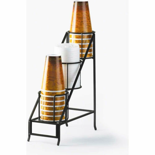 Display your cups and lids with this three tier cup and lid display that features an all around black wire frame that can hold cups and lids up to four inches wide. This stylish organizer utilizes space with it’s vertical, sleek design and is sure to complement any food service event.