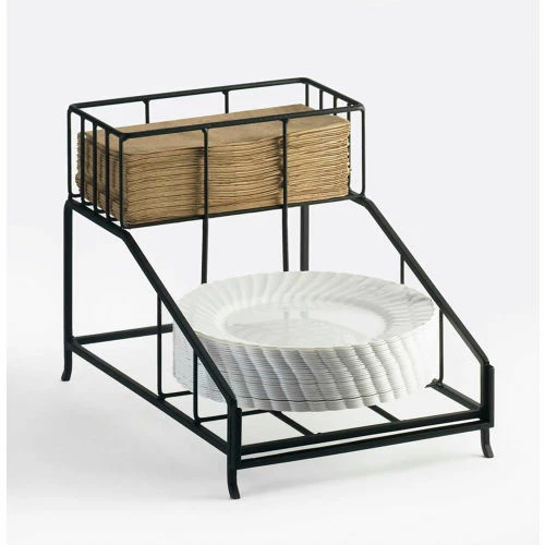This display holds plates and napkins and is perfect for any event This display holds plates and napkins and is perfect for any event. It features a two tiered black frame that will complement any decor and keep things organized at your station. It features a two tiered black frame that will complement any decor and keep things organized at your station.