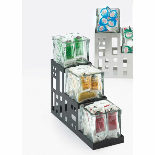 This 3 step jar display is perfect for any party, buffet, or catering event. With this unit you can organize condiment packets, sugar packets, creamers or individual teas without taking up too much counter space. Product Features: Jars Included and are removable for cleaning. Easy for transportation. Durable and modern. Dimensions: 4W x 12D x 7-1/4H.