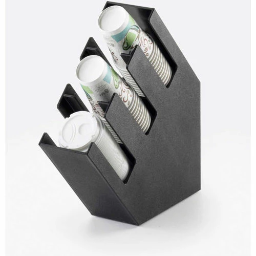 This organizer creates an angle that is visually pleasant and easy to reach out and grab cups and lids. At a near forty five degree angle, cups and lids stay in their compartments while maintaining the simpleness of cup and lid organizers.