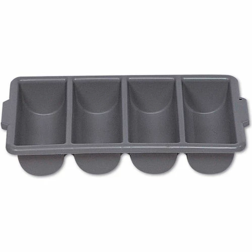 Four-compartment bin is ideal for storage or dispensing cutlery and condiment packets. Ribbed design and special resin material provide strength. Has comfortable handles. Dishwasher safe; NSF certified. Dispenser Type: Utensils/Condiments; Material(s): Plastic.