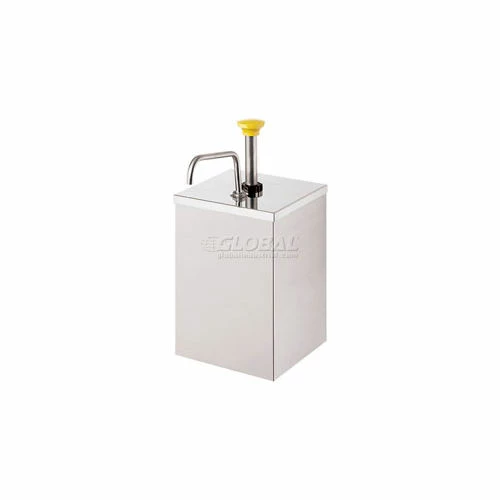 This stainless steel pump with shroud dispenses directly from a #10 can, 3 quart (2.8 L) stainless steel jar 94009 or 1 gallon (3.8 L) jar. The pump dispenses 1 ounce (30 mL) per stroke with the option to reduce portions in 1/8 ounce (3.7 mL) increments, using the supplied gauging collars. A yellow knob is shown, however, black is standard. Pump dispenses thick condiments.
