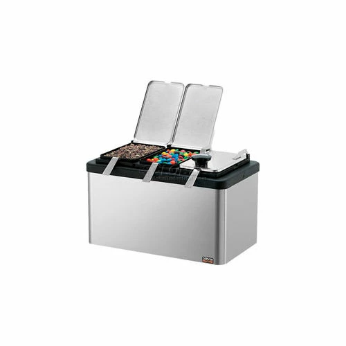 This insulated bar combo includes (3) 1/9-size plastic jars, 6″ (15.2 cm) deep with stainless steel hinged lids and 1 oz (30 mL) ladles (#242801). The brushed finish base reduces the visibility of fingerprints and may be cooled with (2) Eutectic Ice Pack (#242803) or ice. Ice pack is sold separately. Black knobs are standard.